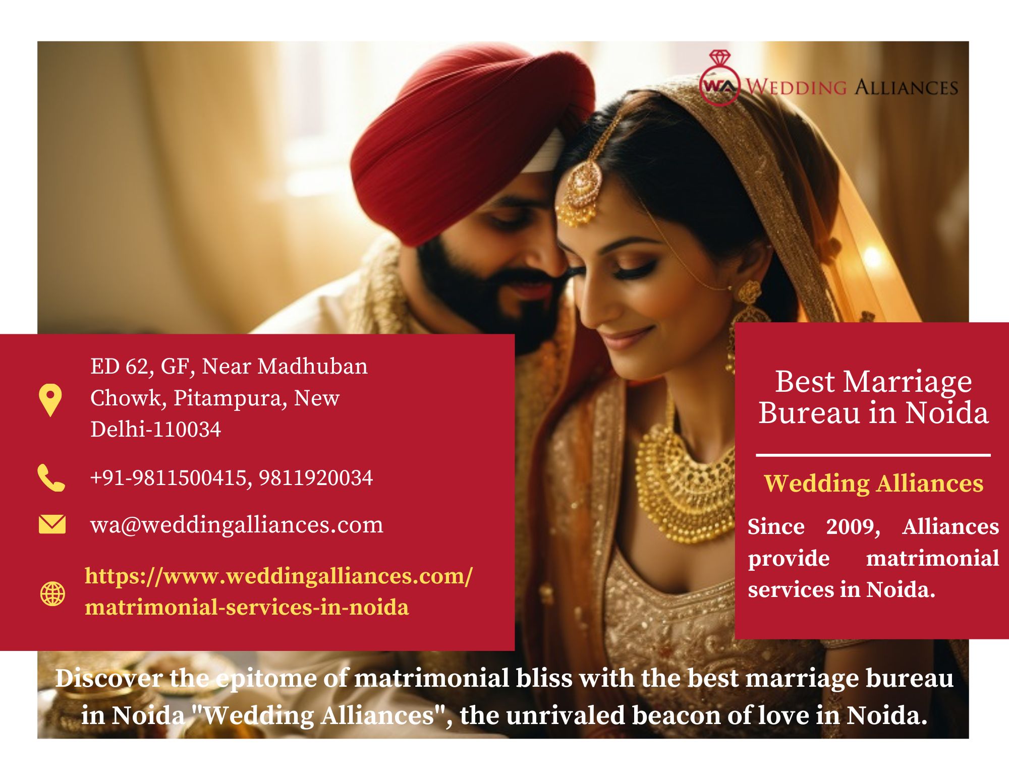 | Descripción | Discover the epitome of matrimonial bliss with the best marriage bureau in Noida "Wedding Alliances", the unrivaled beacon of love in Noida. As the best matrimonial service in Noida, Alliances meticulously craft unions that last a lifetime. With an unmatched track record, we're not just another marriage bureau, we're your trusted companions in finding your soulmate. For more visit https://www.w... |