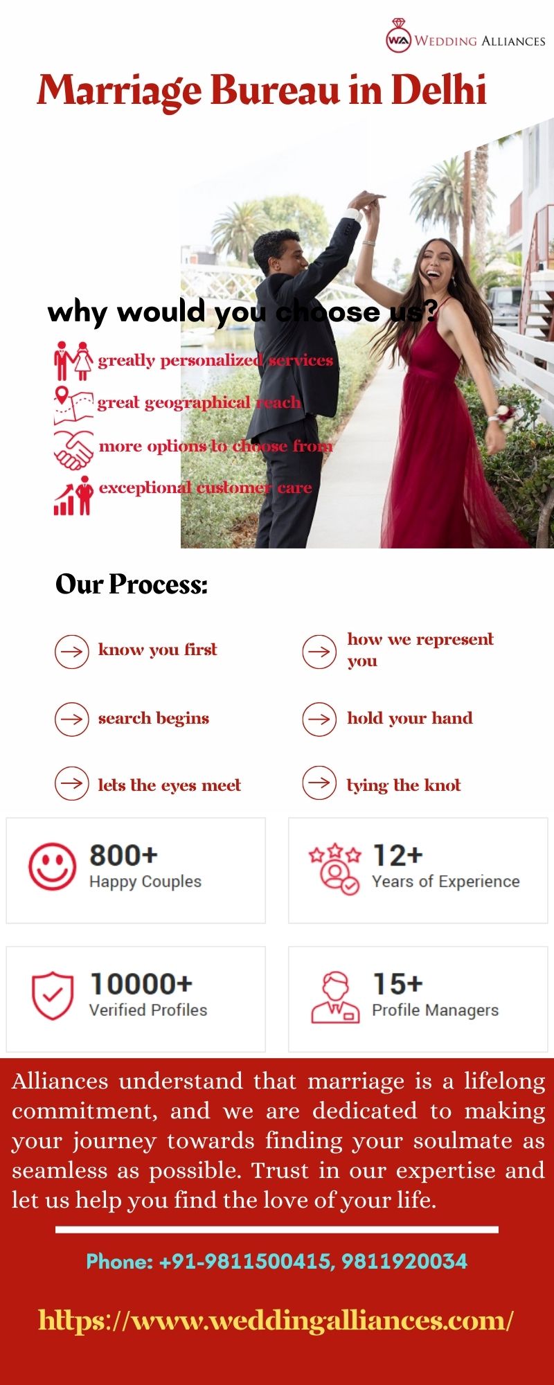 | Descripción | Find the premier Marriage Bureau in Delhi with Wedding Alliances, where your perfect match awaits. Alliances understand that marriage is a lifelong commitment, and we are dedicated to making your journey towards finding your soulmate as seamless as possible. Trust in our expertise and let us help you find the love of your life. For more visit https://www.weddingalliances.com/ |