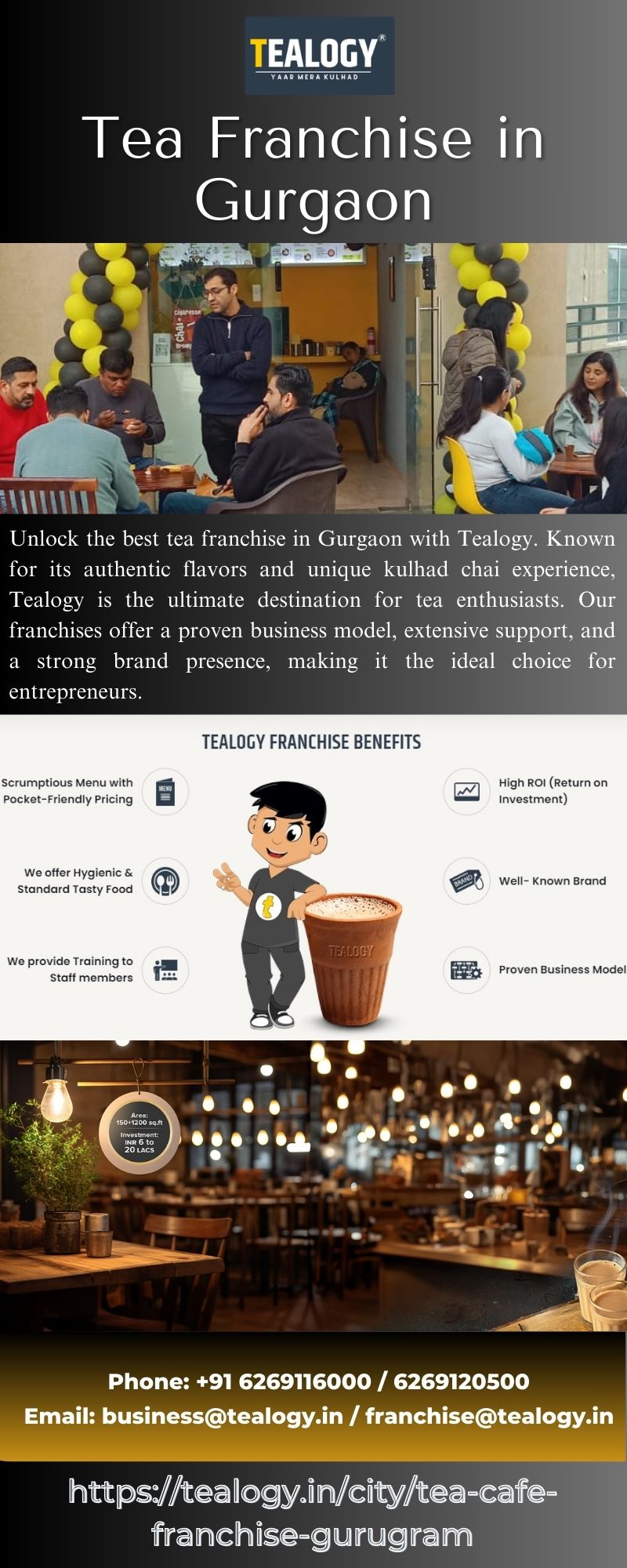 | Descripción | Unlock the best tea franchise in Gurgaon with Tealogy. Known for its authentic flavors and unique kulhad chai experience, Tealogy is the ultimate destination for tea enthusiasts. Our franchises offer a proven business model, extensive support, and a strong brand presence, making it the ideal choice for entrepreneurs. Explore the best kulhad chai franchise opportunities in Gurugram and become pa... |