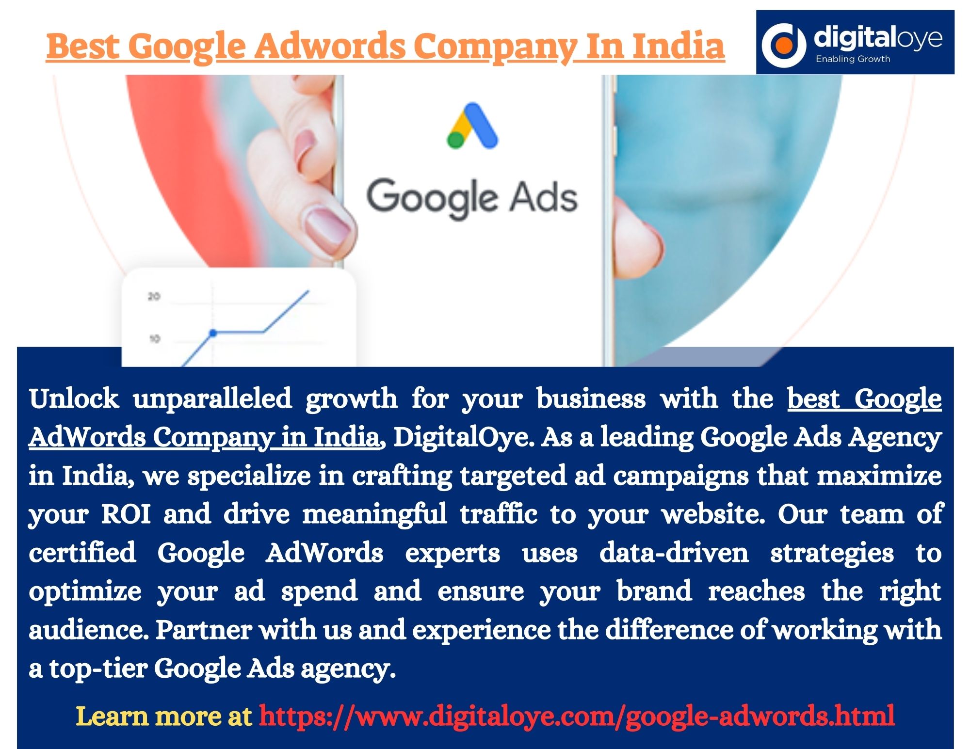 | Descripción | Drive targeted traffic and maximize conversions with DigitalOye, the best Google Adwords Company in India. Our expert team crafts high-performing ad campaigns that deliver measurable results. From keyword research to ad optimization, we ensure your brand stays ahead of the competition. Get cost-effective Google Adwords Services in Delhi tailored to boost your ROI and online visibility. Know mor... |