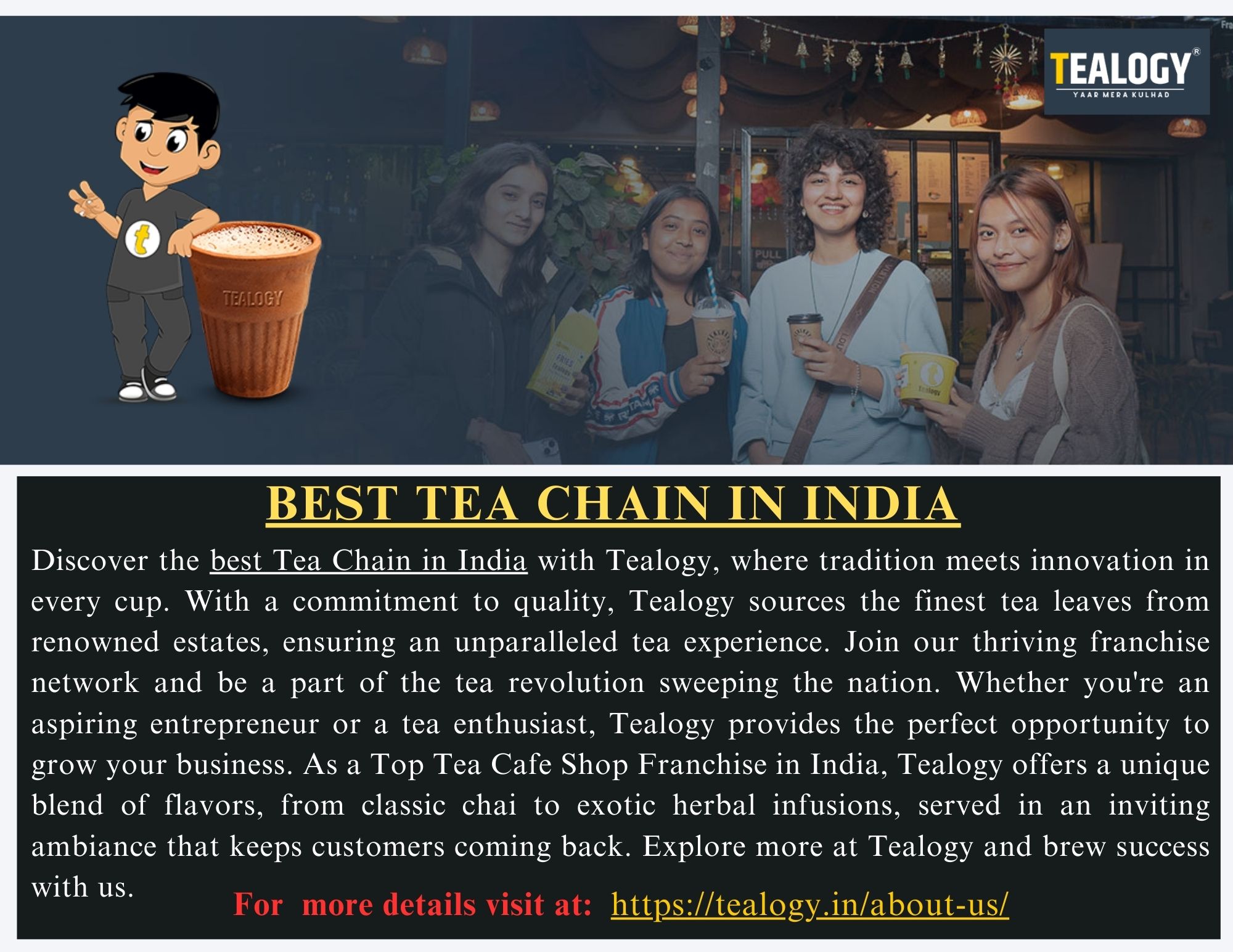 | Descripción | Tealogy stands as the best Tea Chain in India, offering a perfect blend of taste, innovation, and tradition. With its diverse menu of premium teas, aromatic flavors, and delectable accompaniments, Tealogy redefines the tea-drinking experience for enthusiasts across the country. As the Top Tea Cafe Shop Franchise in India, Tealogy provides aspiring entrepreneurs with a lucrative business model, ... |