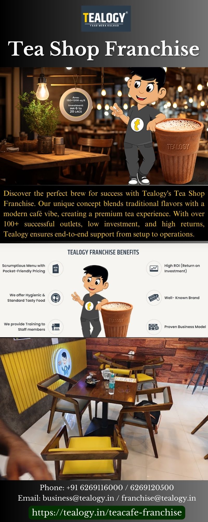 | Descripción | Discover the perfect brew for success with Tealogy's Tea Shop Franchise. Our unique concept blends traditional flavors with a modern café vibe, creating a premium tea experience. With over 100+ successful outlets, low investment, and high returns, Tealogy ensures end-to-end support from setup to operations. Visit https://tealogy.in/teacafe-franchise |