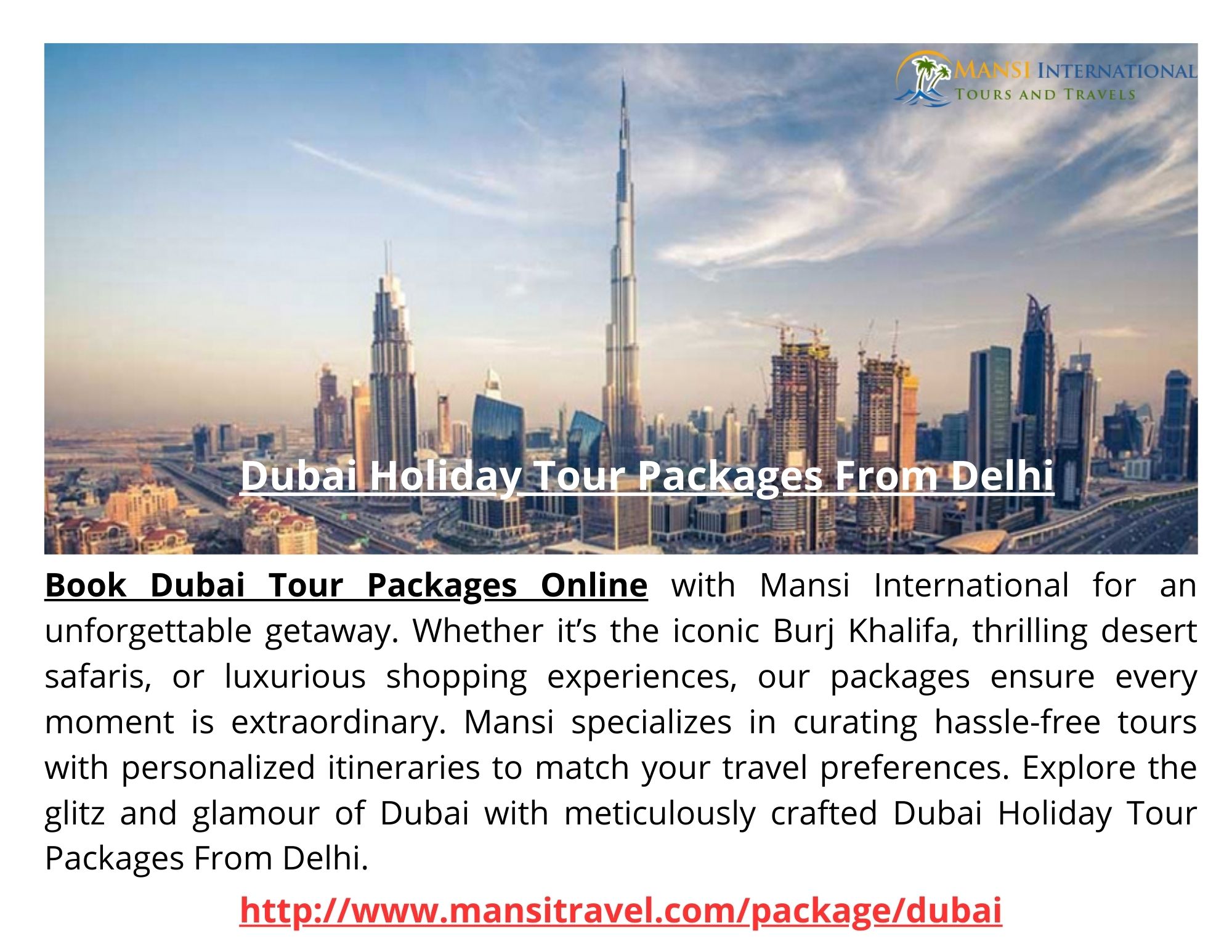 | Descripción | Explore the glitz and glamour of Dubai with meticulously crafted Dubai Holiday Tour Packages From Delhi. Book Dubai Tour Packages Online with Mansi International for an unforgettable getaway. Whether it’s the iconic Burj Khalifa, thrilling desert safaris, or luxurious shopping experiences, our packages ensure every moment is extraordinary. For more details click at http://www.mansitravel.com/pa... |