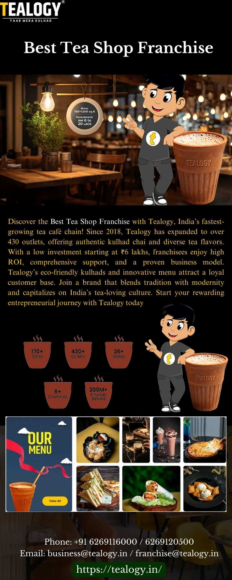 Descripción Join Tealogy, India’s Best Tea Shop Franchise, with 430+ outlets since 2018! Offering authentic kulhad chai, low ₹6 lakh investment, high ROI, and full support, Tealogy’s eco-friendly, innovative menu drives success. Start your profitable tea café journey with Tealogy today! Visit: https://tealogy.in/
