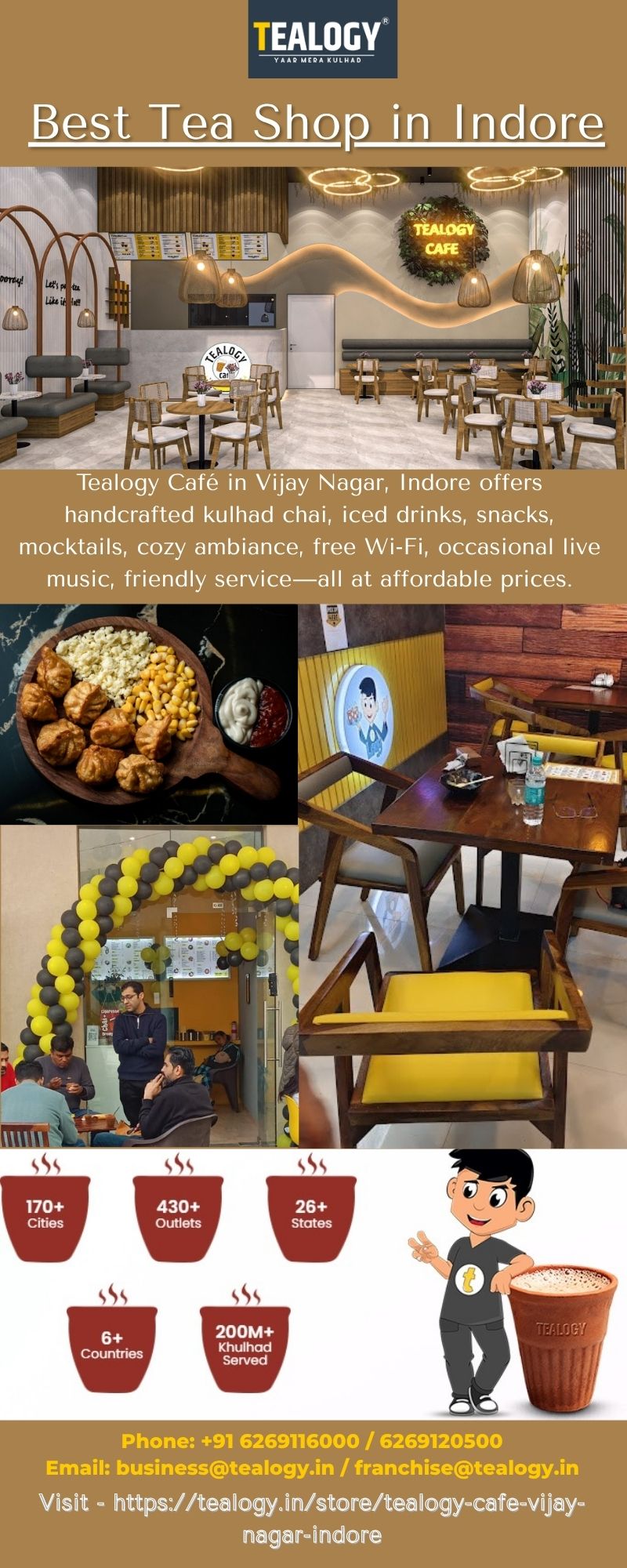 | Descripción | Tealogy Café in Vijay Nagar is the best tea shop in Indore, offering flavorful kulhad chai, creative iced teas, cozy vibes, tasty snacks, and excellent service. To know more, please visit - https://tealogy.in/store/tealogy-cafe-vijay-nagar-indore |