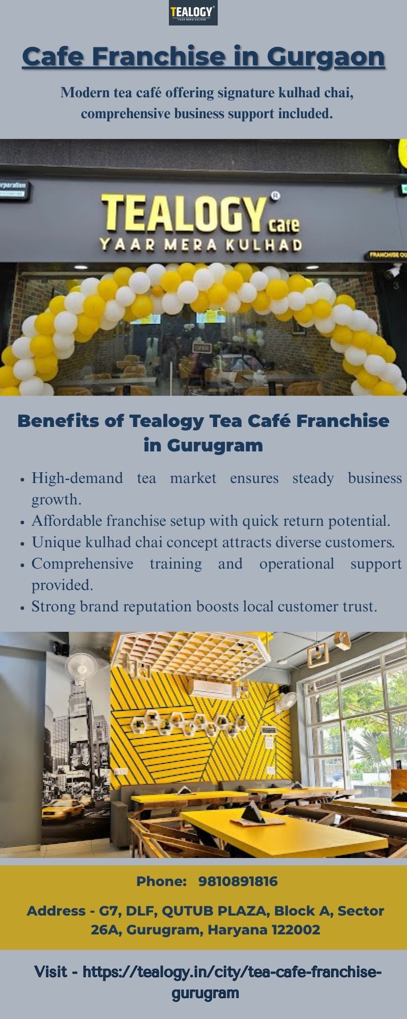 | Descripción | Cafe Franchise in Gurgaon offers Tealogy’s kulhad chai model: traditional clay cups, strong brand support, and a proven business model—perfect for a city with a vibrant tea culture. To know more, please visit - https://tealogy.in/city/tea-cafe-franchise-gurugram |