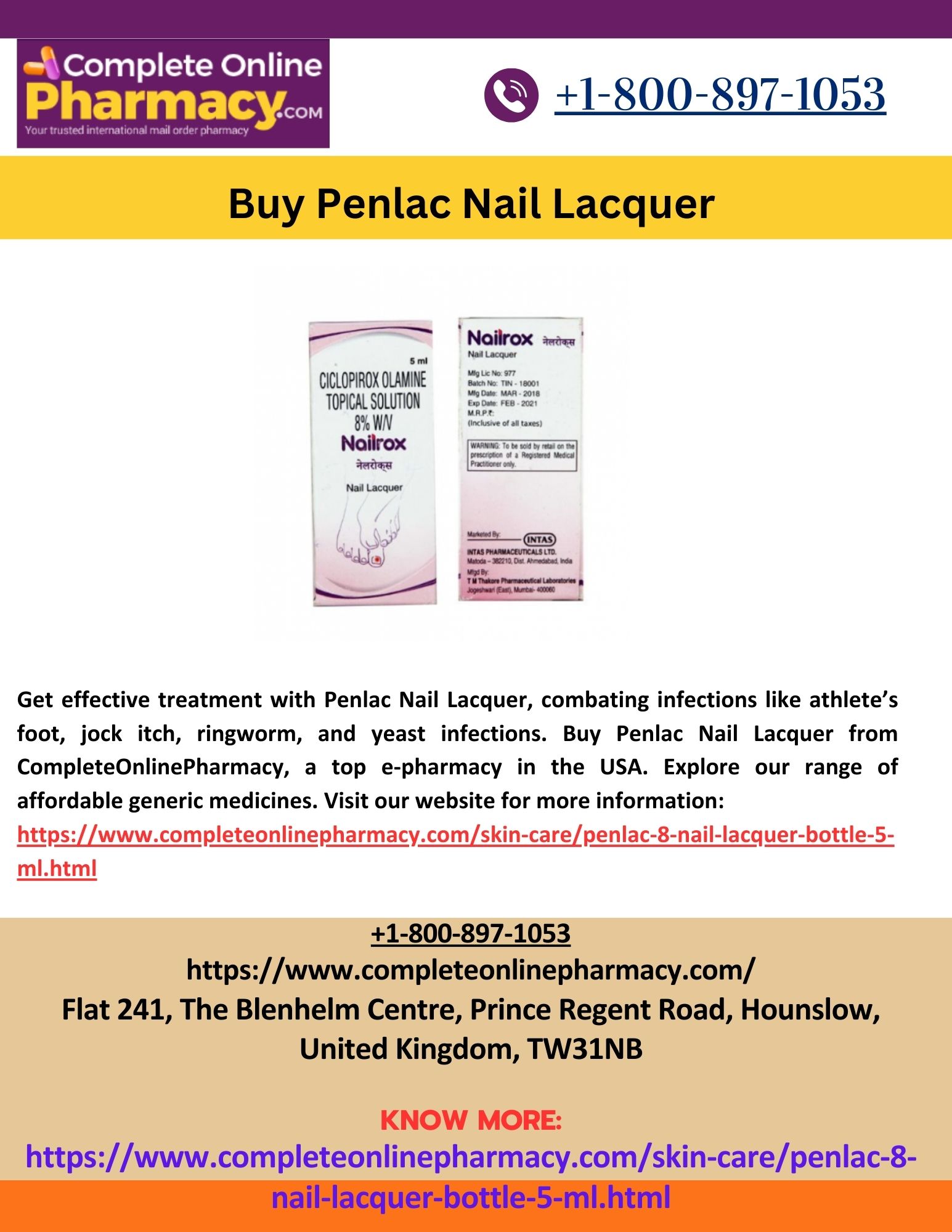| Descripción | Discover the power of Penlac Nail Lacquer for combating various infections including athlete’s foot, jock itch, ringworm, and yeast infections. Obtain this effective treatment from CompleteOnlinePharmacy, a leading e-pharmacy in the USA. Browse through our selection of cost-effective generic medications. For further details, visit our website today. https://www.completeonlinepharmacy.com/skin-... |