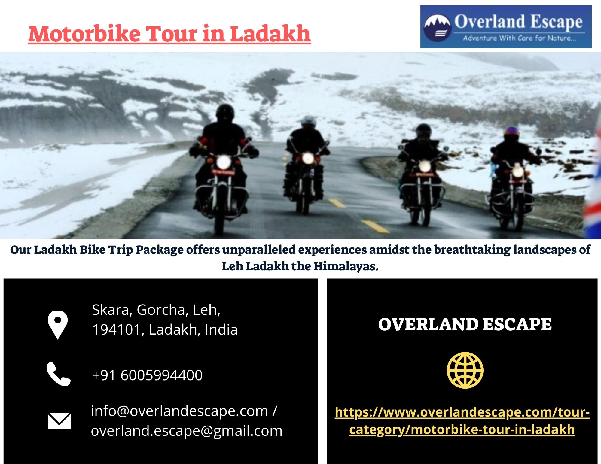 | Descripción | Embark on the ultimate adventure with Overland Escape's Motorbike Tour in Ladakh. Experience the thrill of the open road as you traverse the breathtaking landscapes of Leh Ladakh. With Overland Escape, your safety and comfort are our top priorities. Our seasoned guides and top-notch equipment ensure a hassle-free journey, letting you focus on the awe-inspiring beauty around you. For more visit ... |