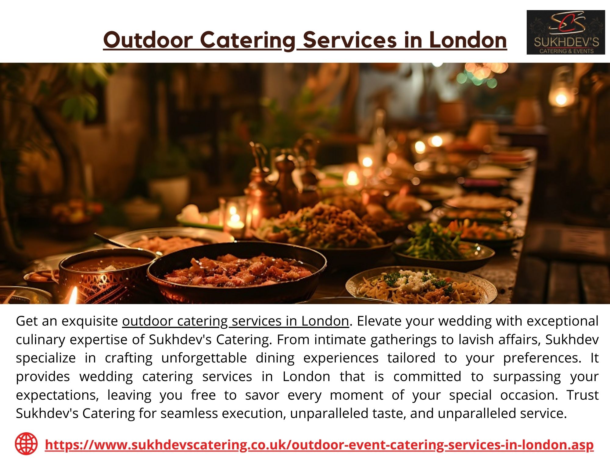 | Descripción | Elevate your event with Sukhdev's Catering, the premier choice for Outdoor Catering Services in London. Whether it's a wedding, corporate gathering, or festive occasion, our expert chefs create exquisite menus tailored to your preferences, ensuring a memorable culinary experience. With over 40 years of excellence, Sukhdev's Catering combines tradition with innovation, delivering mouth-watering ... |