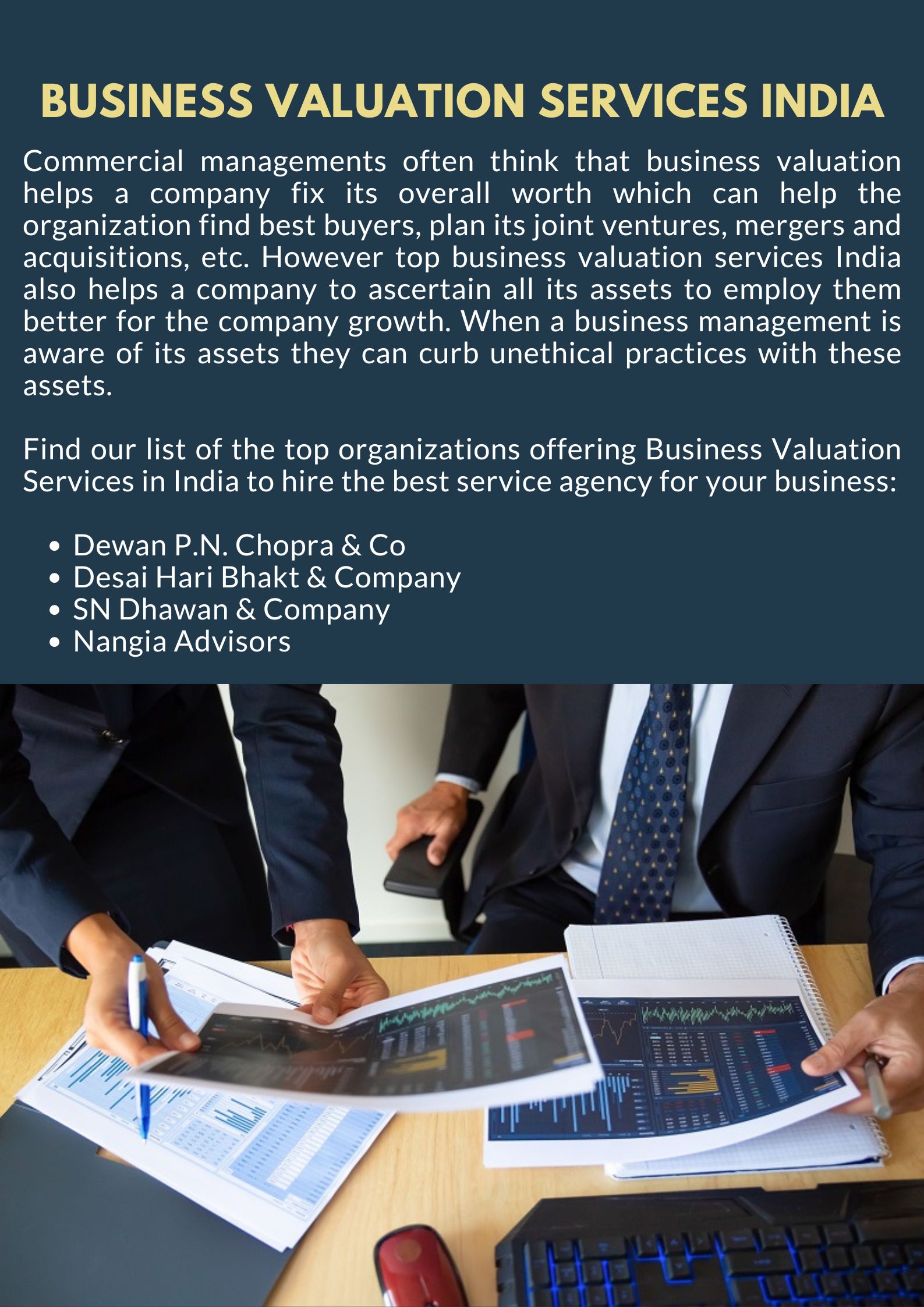 | Descripción | Commercial managements often think that business valuation helps a company fix its overall worth which can help the organization find best buyers, plan its joint ventures, mergers and acquisitions, etc. However top business valuation services India also helps a company to ascertain all its assets to employ them better for the company growth. Find our list of the top organizations offering Bu... |