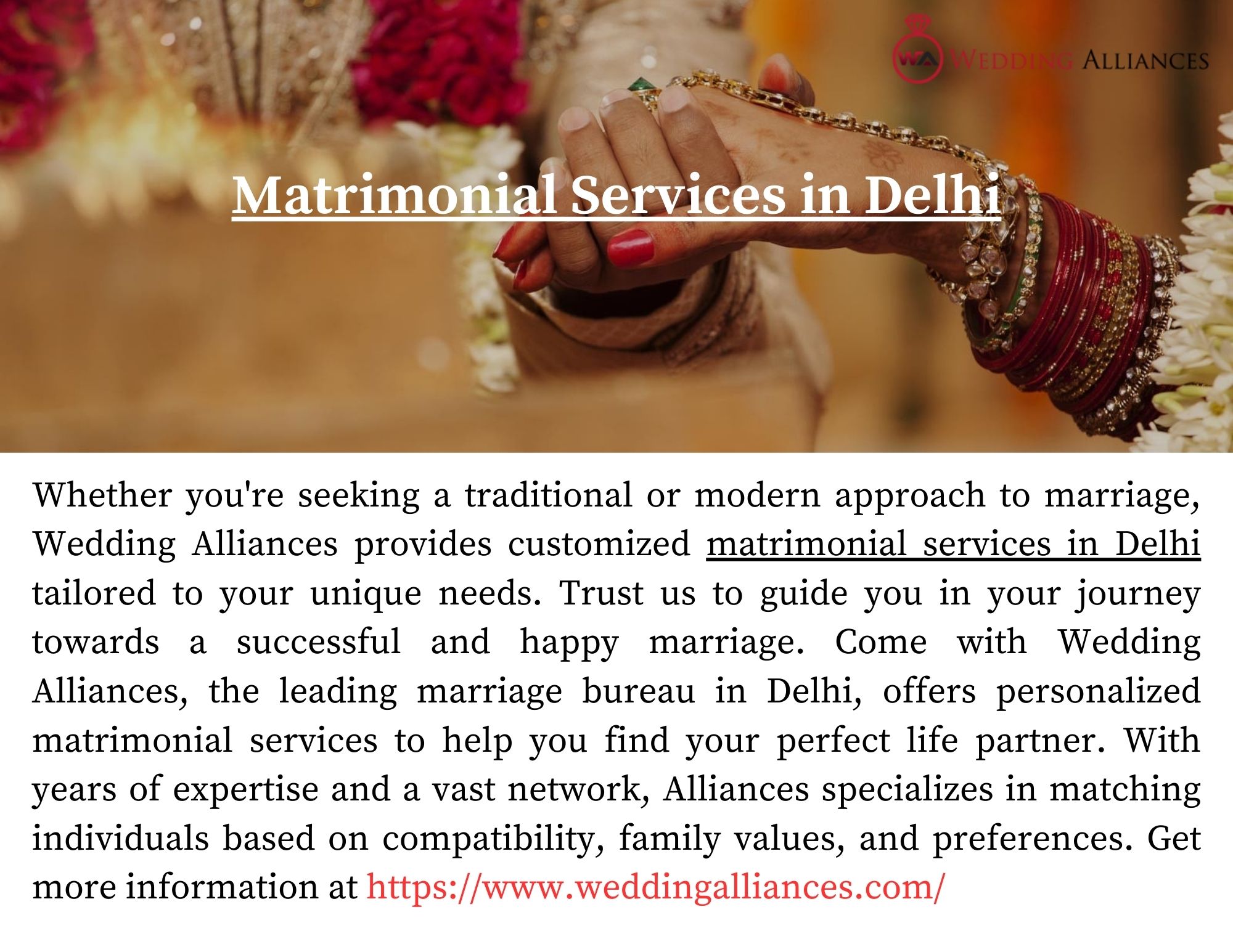 | Descripción | Trust us to guide you in your journey towards a successful and happy marriage. Whether you're seeking a traditional or modern approach to marriage, Wedding Alliances provides customized matrimonial services in Delhi tailored to your unique needs. Visit us and explore our premium matrimonial solutions today at https://www.weddingalliances.com/ |