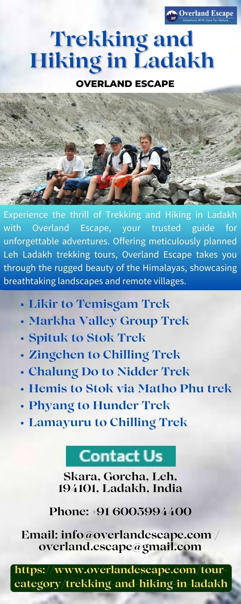 | Descripción | Experience the thrill of Trekking and Hiking in Ladakh with Overland Escape, your trusted guide for unforgettable adventures. Offering meticulously planned Leh Ladakh trekking tours, Overland Escape takes you through the rugged beauty of the Himalayas, showcasing breathtaking landscapes and remote villages. For get the best Trekking in Ladakh packages click at https://www.overlandescape.com/tou... |