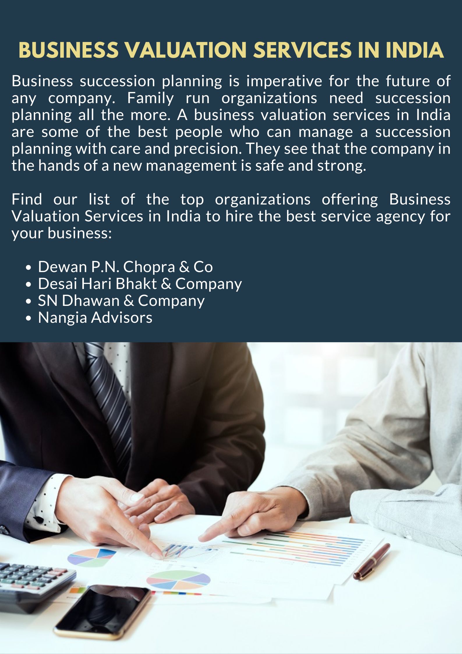 Descripción Business succession planning is imperative for the future of any company. Family run organizations need succession planning all the more. A business valuation services in India are some of the best people who can manage a succession planning with care and precision. They see that the company in the hands of a new management is safe and strong. Find our list of the top organizations offering ...
