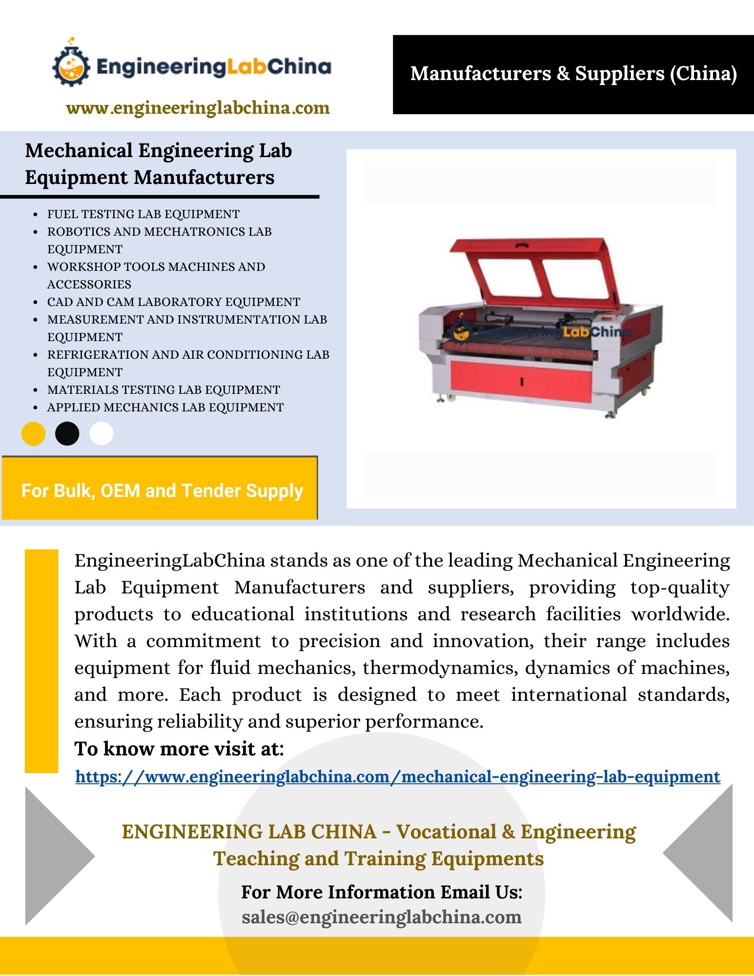 | Descripción | EngineeringLabChina stands as one of the leading Mechanical Engineering Lab Equipment Manufacturers and suppliers, providing top-quality products to educational institutions and research facilities worldwide. With a commitment to precision and innovation, our range includes equipment for fluid mechanics, thermodynamics, dynamics of machines, and more. For more details visit https://www.engineer... |