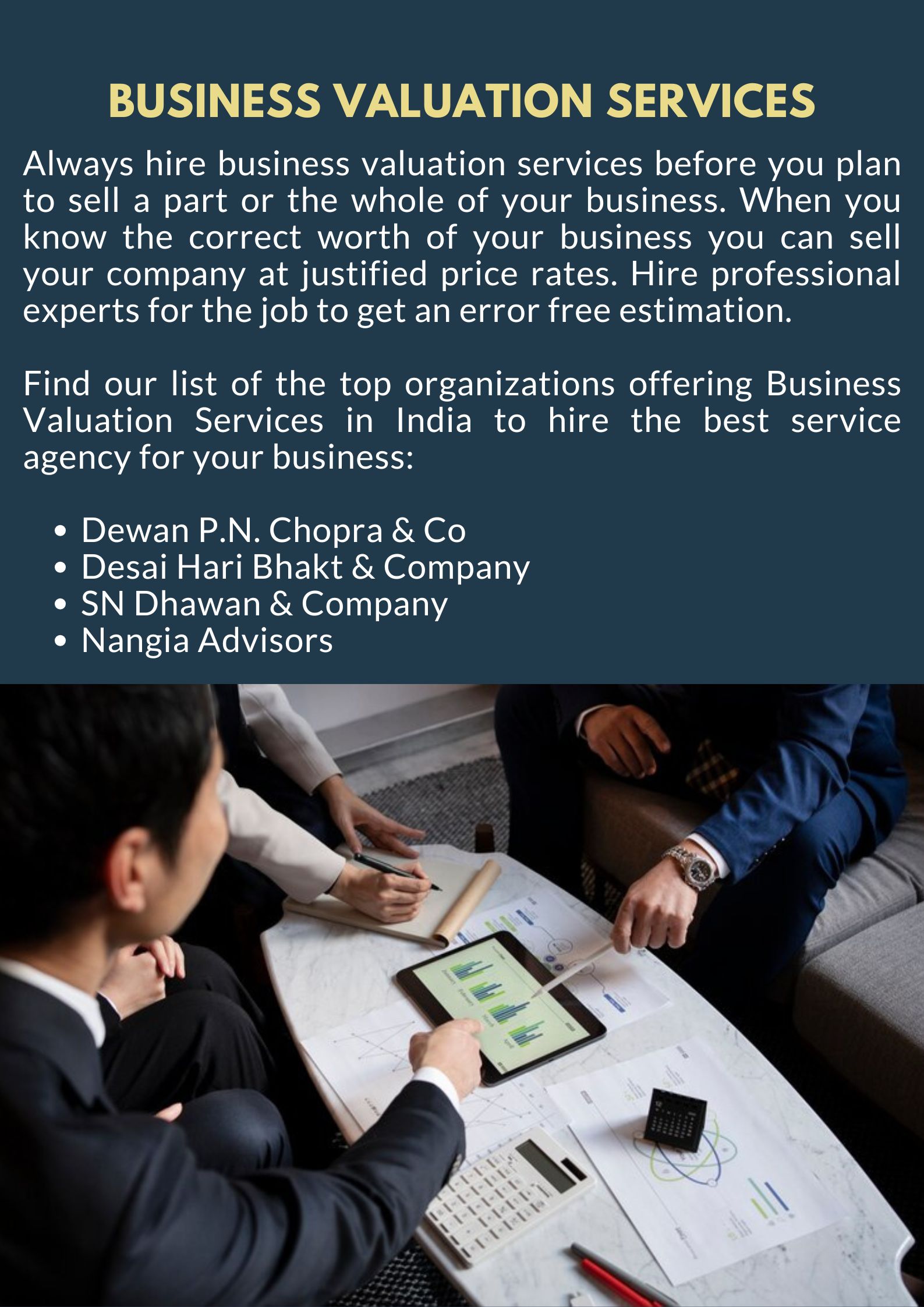 Descripción Always hire business valuation services before you plan to sell a part or the whole of your business. When you know the correct worth of your business you can sell your company at justified price rates. Hire professional experts for the job to get an error free estimation. Find our list of the top organizations offering Business Valuation Services in India to hire the best service agency for...