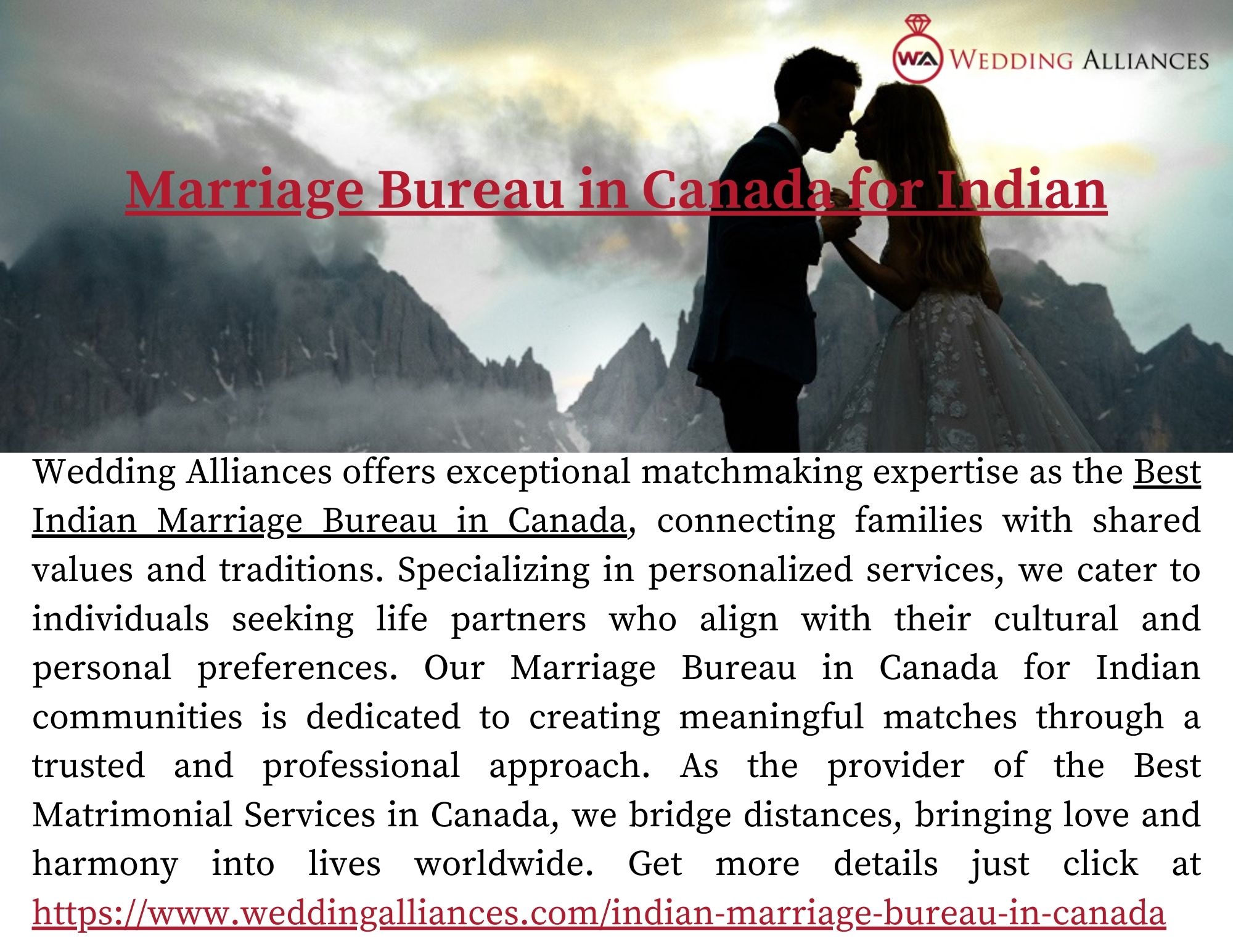 | Descripción | With an extensive database and meticulous attention to detail, Wedding Alliances ensures every profile is thoughtfully curated for compatibility. Our Marriage Bureau in Canada for Indian communities is dedicated to creating meaningful matches through a trusted and professional approach. Trust Wedding Alliances to guide you in finding the perfect partner. For more details, visit https://www.wedd... |