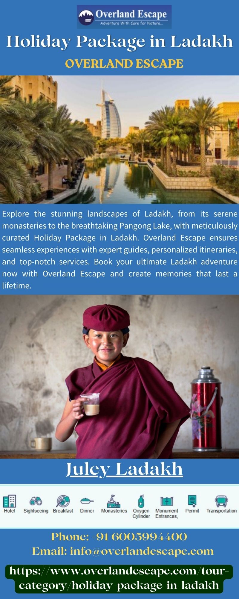 | Descripción | Overland Escape ensures seamless experiences with expert guides, personalized itineraries, and top-notch services. Whether it's a cultural exploration, adventure tour, or tranquil retreat, their Holiday Package in Ladakh caters to every traveler's desire. Book your ultimate Ladakh adventure now with Overland Escape and create memories that last a lifetime. For more visit https://www.overlandesc... |