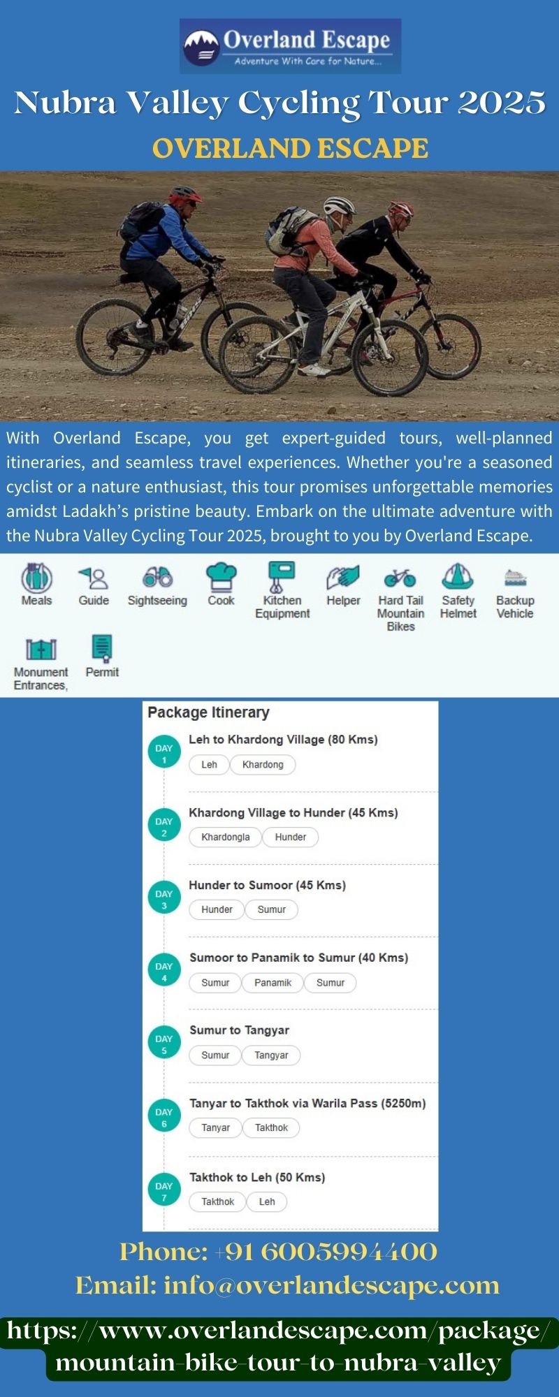 | Descripción | Embark on the ultimate adventure with the Nubra Valley Cycling Tour 2025, brought to you by Overland Escape. Our Cycling Tour Packages in Nubra Valley are crafted to offer a perfect blend of adrenaline and tranquility, showcasing picturesque sand dunes, ancient monasteries, and vibrant local culture. To know more visit https://www.overlandescape.com/package/mountain-bike-tour-to-nubra-valley |