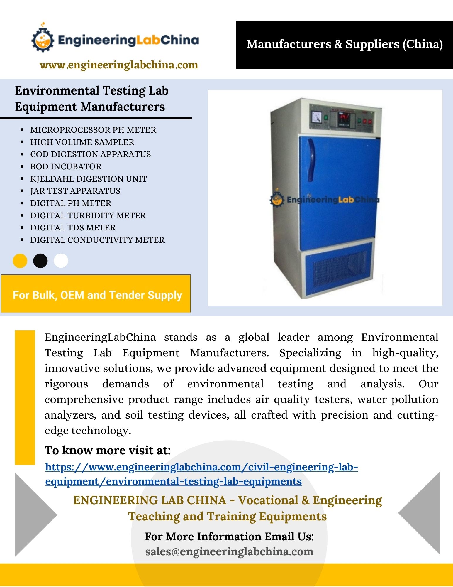| Descripción | EngineeringLabChina stands as a global leader among Environmental Testing Lab Equipment Manufacturers. Specializing in high-quality, innovative solutions, we provide advanced equipment designed to meet the rigorous demands of environmental testing and analysis. Our comprehensive product range includes air quality testers, water pollution analyzers, and soil testing devices, all crafted with pre... |