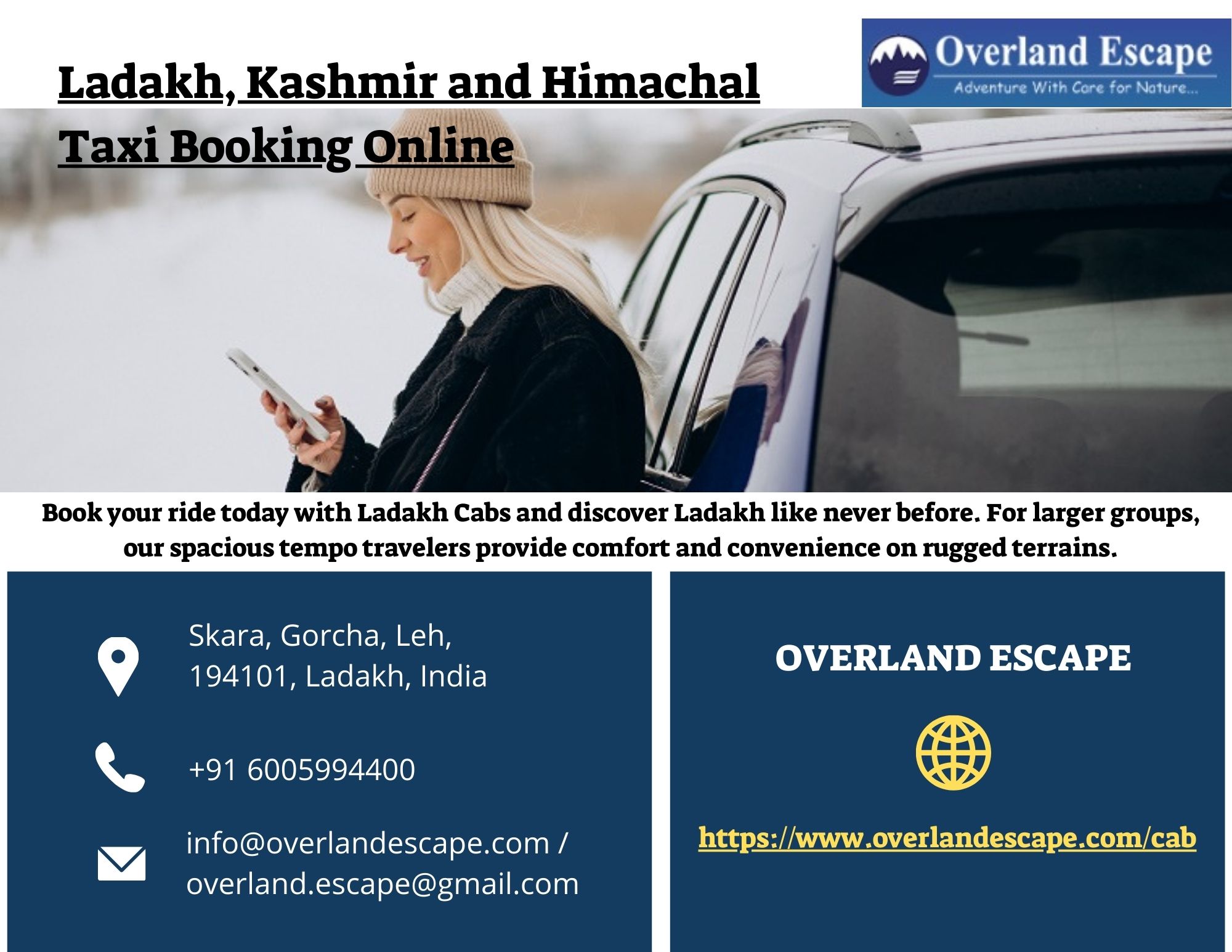 | Descripción | Explore the breathtaking landscapes of Ladakh with Overland Escape's Ladakh, Kashmir and Himachal Taxi Booking Online. Whether you're traveling solo, with family, or in a group, we offer well-maintained vehicles, professional drivers, and unmatched reliability to ensure your journey is safe and memorable. Click to know more at https://www.overlandescape.com/cab |