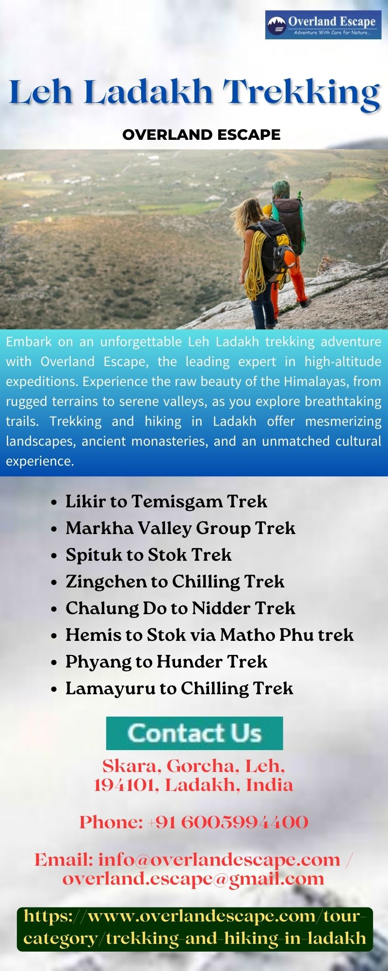 | Descripción | Embark on an unforgettable Leh Ladakh trekking adventure with Overland Escape, the leading expert in high-altitude expeditions. Experience the raw beauty of the Himalayas, from rugged terrains to serene valleys, as you explore breathtaking trails. Whether you're a seasoned trekker or a beginner, our meticulously crafted itineraries ensure the perfect balance of thrill and comfort. To know more ... |