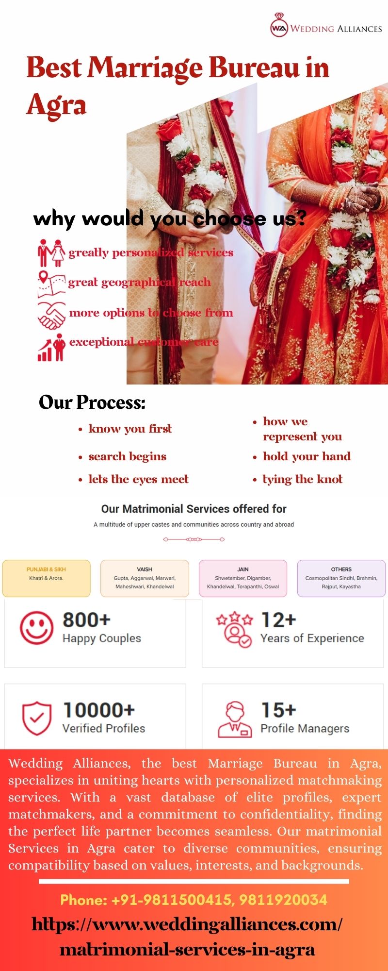 | Descripción | Wedding Alliances, the best Marriage Bureau in Agra, specializes in uniting hearts with personalized matchmaking services. With a vast database of elite profiles, expert matchmakers, and a commitment to confidentiality, finding the perfect life partner becomes seamless. Our matrimonial Services in Agra cater to diverse communities, ensuring compatibility based on values, interests, and backgrou... |