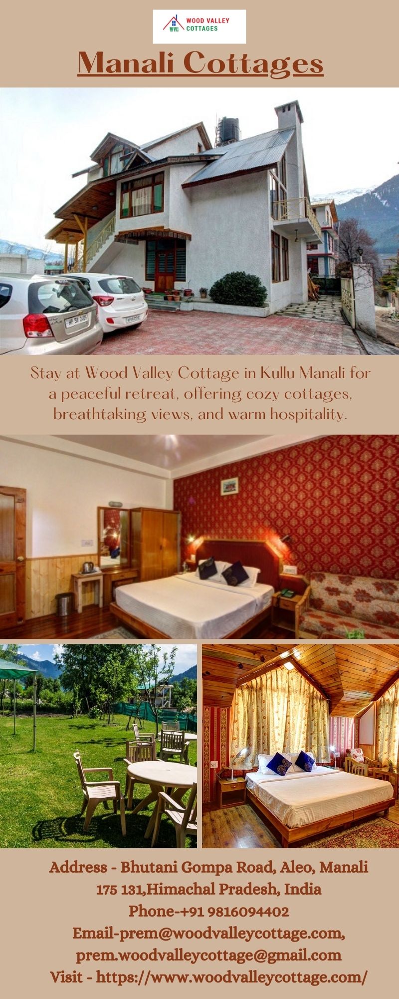 | Descripción | Wood Valley Cottage is one of the famous Manali Cottages that offers a comfortable and budget friendly ambience to the tourists. This hotel ensures good room service facility along with proper cleanliness and prompt help to its customers. Enjoy the charming beauty of Manali with the reasonable budget Manali cottages. Visit us at - https://www.woodvalleycottage.com/ |