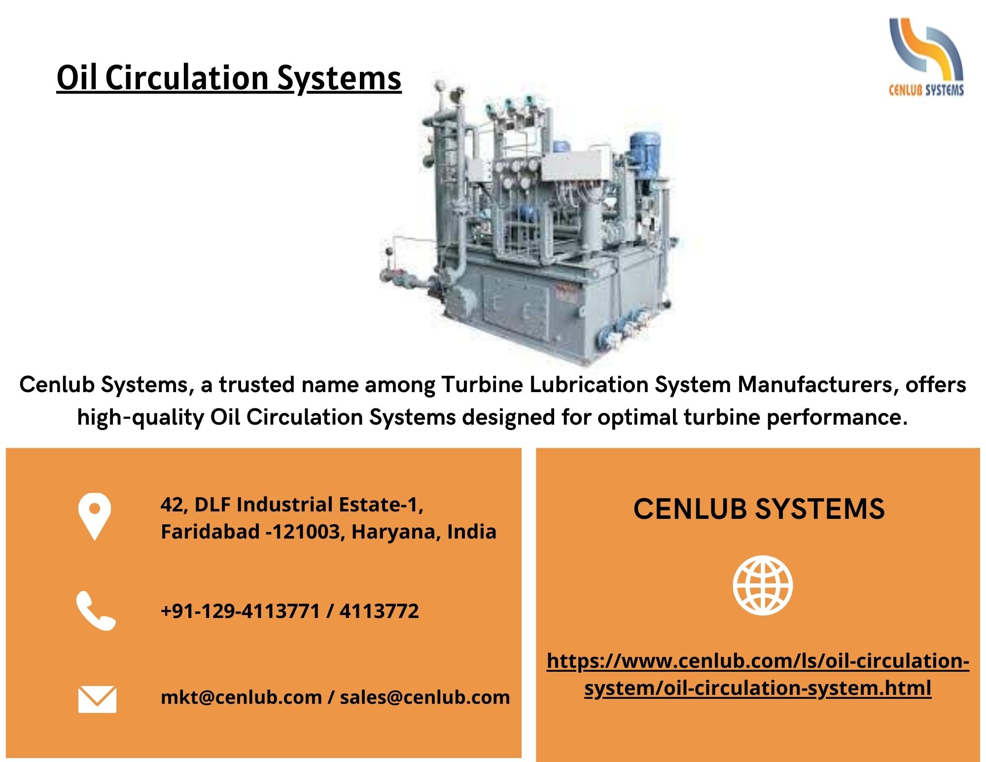 | Descripción | Cenlub Systems, a trusted name among Turbine Lubrication System Manufacturers, offers high-quality Oil Circulation Systems designed for optimal turbine performance. Our systems ensure continuous lubrication, cooling, and filtration, extending equipment life and minimizing downtime. Engineered for precision and reliability, Cenlub’s solutions cater to diverse industrial needs, maintaining seamle... |