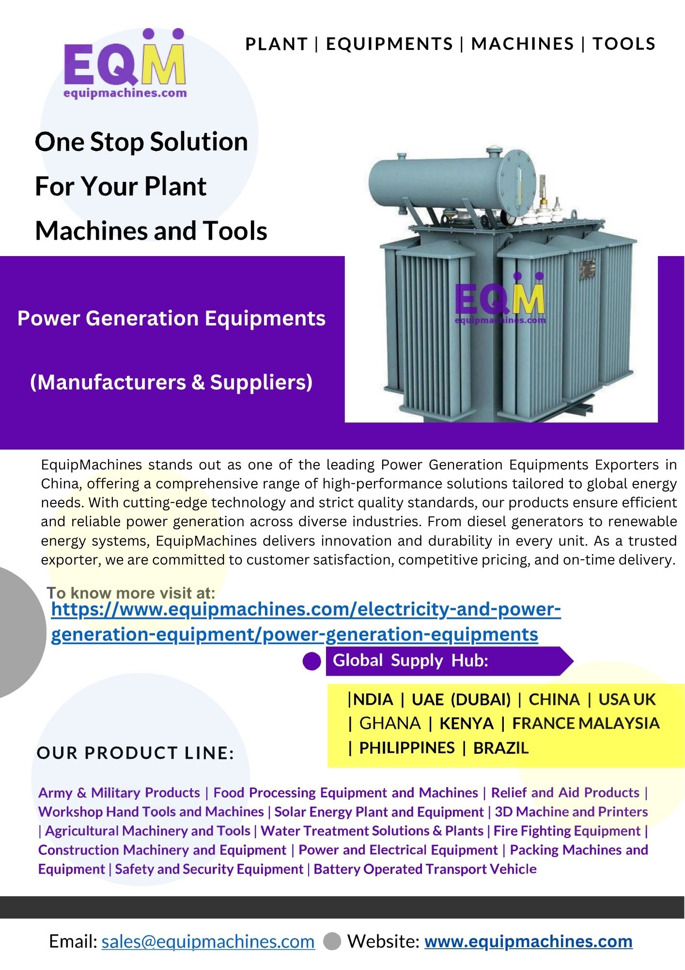 | Descripción | EquipMachines stands out as one of the leading Power Generation Equipments Exporters in China, offering a comprehensive range of high-performance solutions tailored to global energy needs. With cutting-edge technology and strict quality standards, our products ensure efficient and reliable power generation across diverse industries. For more visit https://www.equipmachines.com/electricity-and-p... |